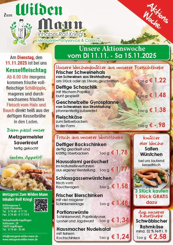 Bei der Metzgerei Wilder Mann erhalten Sie wöchentlich wechselnde Aktionsangebote aus unserer Fleisch-und Wursttheke mit leckeren Rezeptvorschlägen.